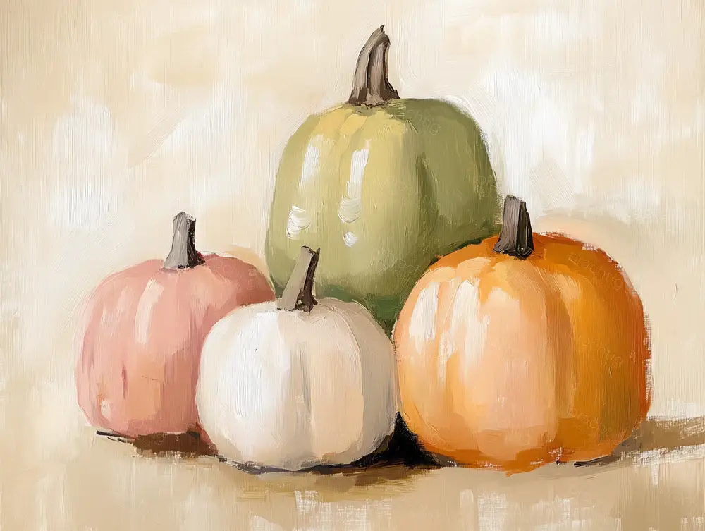 Vier pompoenen staan trots bij elkaar en brengen warme herfsttinten in je ruimte. De combinatie van zachte oranje, groene, roze en witte tinten geeft een uitnodigende sfeer. De dikke penseelstreken tonen de textuur van de pompoenen, waardoor ze bijna tastbaar lijken. De rustige, neutrale achtergrond laat de kleuren stralen. In de stijl van de Hollandse meesters vangt dit stilleven de essentie van het seizoen. Hang het in je keuken of eetkamer voor een knusse, seizoensgebonden sfeer. Het schilderij straalt gezelligheid en warmte uit en nodigt je uit om het seizoen te omarmen.