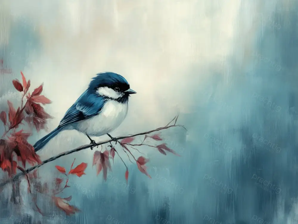 Dit prachtige schilderij toont een serene scène van een kleine zangvogel op een dunne tak. De vogel heeft een opvallend blauw en wit verenkleed, wat een mooi contrast vormt met de rustieke rode bladeren om hem heen. De achtergrond is sfeervol en dromerig, met zachte tinten blauw en wit die een kalmerende sfeer uitstralen. De kunststijl is verfijnd en details zijn zorgvuldig uitgewerkt, waardoor het geheel een natuurlijke uitstraling heeft. Dit kunstwerk voegt een rustgevende en elegante touch toe aan jouw woonkamer, slaapkamer of kantoor. Perfect voor iedereen die van natuur en rust houdt.
