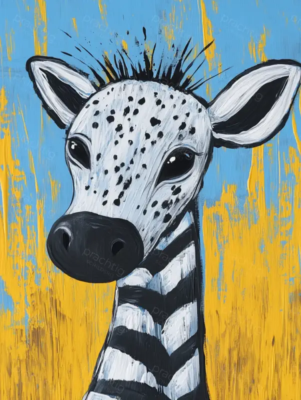 Een charmante zebra kijkt nieuwsgierig naar je vanuit dit schilderij. De speelse combinatie van blauw en geel op de achtergrond zorgt voor een vrolijke sfeer. De dikke penseelstreken maken de zebra levendig en geven het geheel een speelse uitstraling. De zwart-witte strepen van de zebra contrasteren mooi met de kleurrijke achtergrond, wat het beeld dynamisch maakt. Deze expressieve expressie van het dier trekt meteen je aandacht en brengt een glimlach op je gezicht. Dit werk past perfect in een kinderkamer of speelruimte, waar het een vrolijke noot toevoegt.