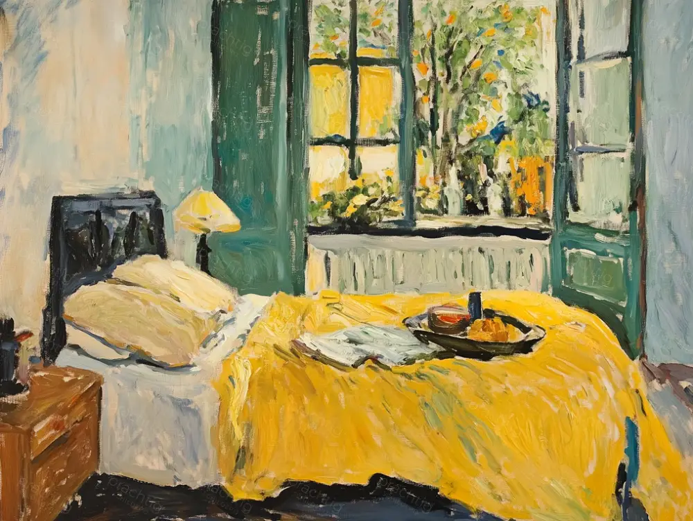 Stap een zonovergoten kamer binnen. Een felgeel dekbed ligt uitnodigend op het bed. Het raam staat wijd open en biedt een prachtig uitzicht op een bloeiende tuin. De groene luiken geven het geheel een frisse uitstraling. Je voelt de warmte van de zonnestralen in de kamer. De dikke penseelstreken geven het schilderij een levendige textuur. Dit werk brengt een vrolijke sfeer in jouw slaapkamer of woonkamer.