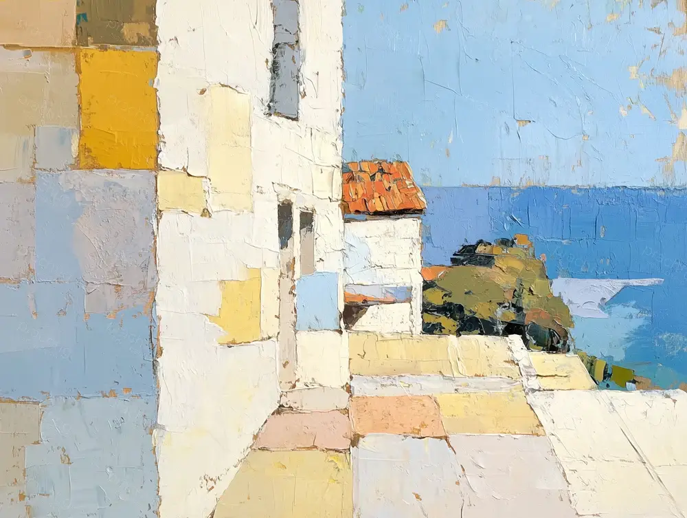 Een helder tafereel van een zonnige kuststreek. De warme oker- en gele tinten van de muren contrasteren prachtig met de koele blauwe lucht en zee. De dikke, zichtbare penseelstreken voegen een tastbare textuur toe, waardoor de mediterrane sfeer tot leven komt. Het lijkt alsof je door een raam naar een serene zee kijkt, omringd door rustieke architectuur. Deze scène vangt de tijdloze charme van een zomerse dag aan de kust. De compositie is in de stijl van de beroemde Nederlandse schilder Mondriaan, met zijn geometrische vormen en kleurvlakken. Dit werk brengt warmte en rust in je ruimte en is ideaal voor de woonkamer of een gezellig café.