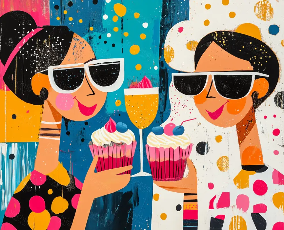 Twee vriendinnen genieten samen van een feestelijk moment. Ze dragen opvallende zonnebrillen en houden kleurige cupcakes vast. De achtergrond is een vrolijke mix van felle kleuren en stippen. Deze levendige compositie straalt plezier uit. Het gebruik van felle tinten zoals roze, geel en blauw maakt het werk speels en energiek. Ideaal voor een kinderkamer of keuken. Laat je inspireren door de zorgeloze sfeer en het optimisme dat deze scène uitstraalt.