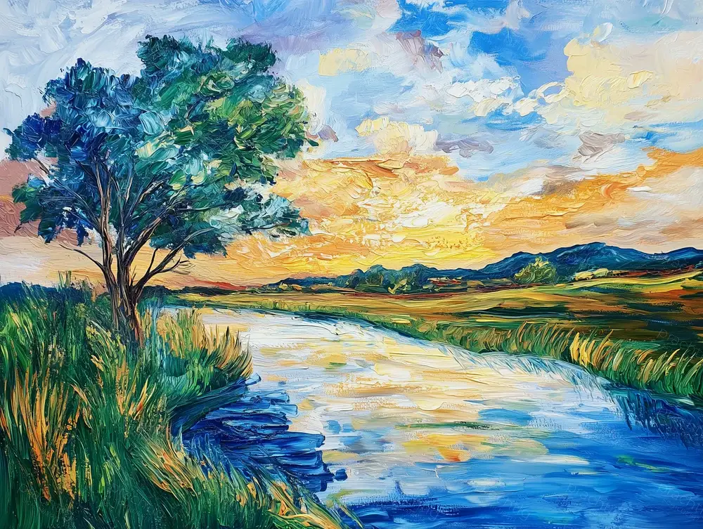 Een indrukwekkend landschap met een zonsondergang weerspiegeld in een vredige rivier. Dit schilderij, in de stijl van Van Gogh, vangt de schoonheid van de natuur met levendige penseelstreken. De lucht is een spectaculaire mix van geel, oranje en blauw, terwijl de rivier als een spiegel het licht vangt. Het groene gras en de bomen aan de oever creëren een rustgevende en harmonieuze sfeer. De dynamische penseelstreken geven het werklevendigheid en beweging, alsof de wind door de bladeren waait. Hang het in je woonkamer of kantoor voor een vleugje serene natuur.