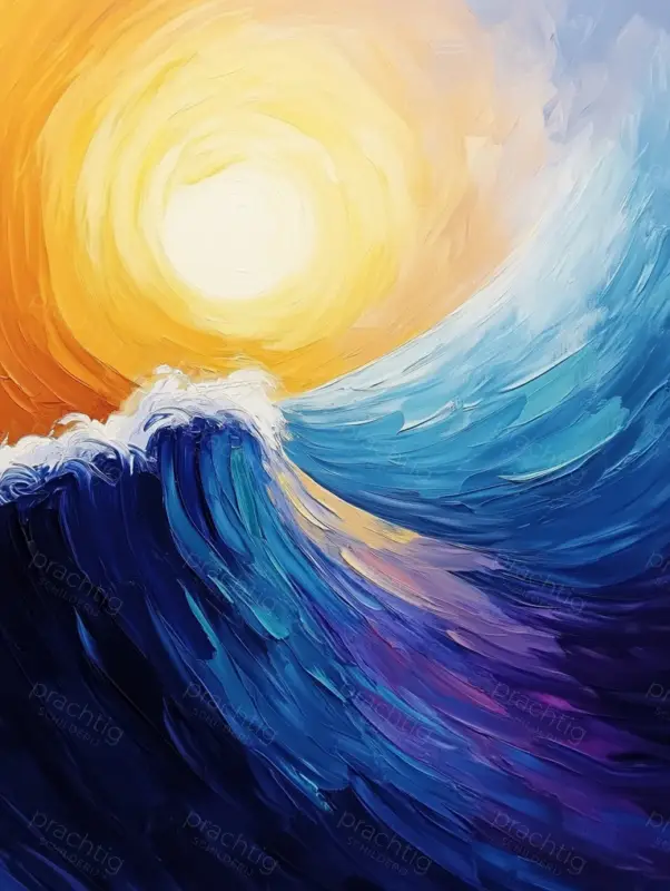 Ervaar de energie van een torenhoge golf die naar de zon reikt. De felle oranje en gele tinten van de zon contrasteren prachtig met de diepblauwe en paarse kleuren van het water. Je ziet de krachtige penseelstreken die de beweging en dynamiek vangen. Dit werk brengt je een gevoel van vrijheid en kracht. Ideaal voor jouw woonkamer of kantoor om een energieke sfeer te creëren.