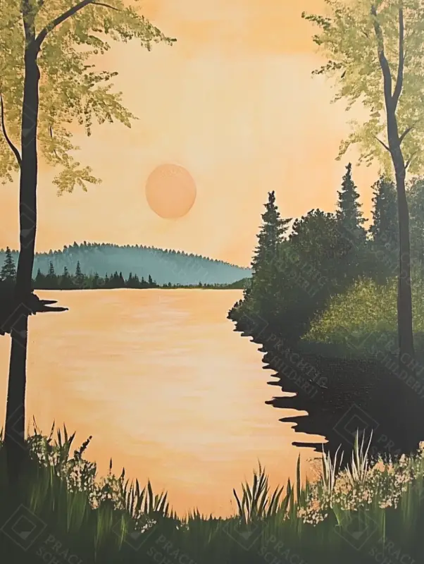 Voel de rust van een zomerse avond wanneer je blik valt op dit schilderij. De zon lijkt te zinken in de horizon, terwijl de hemel een warme gloed van oranje en geel uitstraalt. De silhouetten van bomen omarmen het landschap en bieden een gevoel van geborgenheid.