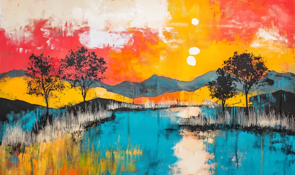 Dit schilderij vangt de oogverblindende pracht van een zonsondergang boven een vredige landschapsscene. De vurige oranje en roze tinten van de lucht contrasteren prachtig met de diepblauwe en turquoise tinten van het water. Zwarte silhouetten van bomen en bergen voegen diepte en mysterie toe. De dikke penseelstreken geven textuur aan het geheel en laten het kunstwerk tot leven komen. Deze levendige compositie is perfect voor jouw woonkamer, slaapkamer of kantoorruimte. Laat de energie en kleur van dit schilderij jouw interieur opfleuren!