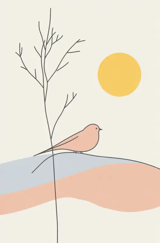 Een eenvoudige vogel zit rustig op een tak, met een heldere gele zon aan de horizon. De zachte pasteltinten van roze en blauw zorgen voor een kalme sfeer. De minimalistische lijnen van de boom en de vogel geven het geheel een strakke uitstraling. Dit beeld straalt rust en eenvoud uit, ideaal voor een plek waar je wilt ontspannen. De subtiele kleuren passen goed in een moderne omgeving.