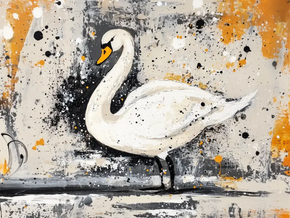 Dit schilderij toont een sierlijke zwaan, die gracieus tegen een dynamische achtergrond staat. De kunstenaar gebruikt een mix van zwart, wit, en oranje spetters, waardoor de zwaan bijna tot leven komt. De dikke penselen geven textuur en diepte aan de veren van de zwaan. De achtergrond is levendig met abstracte patronen, wat de zwaan zelf expressief laat uitkomen. Deze combinatie van realisme en abstractie trekt je meteen naar het schilderij toe. Het werk straalt rust en beweging uit, perfect voor een moderne woonkamer of creatieve ruimte. Het design nodigt je uit om langer te kijken en nieuwe details te ontdekken.