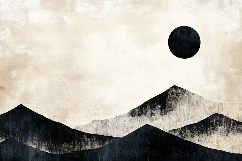 Ontdek de serene schoonheid van dit minimalistische landschap. De abstracte bergen, weergegeven in zachte tinten zwart en grijs, creëren een rustgevend contrast tegen een effen, lichte achtergrond. De grote zwarte cirkel bovenaan trekt direct de aandacht en nodigt uit tot interpretatie. Is het een zon of een maan? De eenvoud en harmonie van het ontwerp roepen een gevoel van kalmte en mysterie op. Dit schilderij past prachtig in een moderne woonkamer of kantoorruimte en brengt een gevoel van stilte en balans. Het doet denken aan de strakke lijnen en vormen van abstracte kunst.